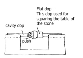 There are apparent advantages to this system. Early removal of the original dop avoids a danger of movement of the stone, which is a problem when the original dop is removed as a last step. It also corrects the effect of any mechanical error in the straightness of the original dop. This particular method was taught at the ULTRA TEC Faceting School by Ed Danbom, who is a noteworthy custom faceter. John Grieger's version of this "remove and realign" method, using no transfer fixture at all, was to place a prepared cavity dop into the faceting head, which was set at 90°. Then he would use an accurate 90° block which was set on the lap or platen as a square surface to push against. This method is a little trickier in that it depends on the forward thrust of the dop, which is accomplished by sliding the faceting head forward to equalize pressure against the rim of the cavity dop and to eliminate lateral angular errors.